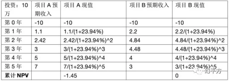 同理经过计算当贴现率为23.94%时,项目B的NPV刚好等于0,如下表所示: